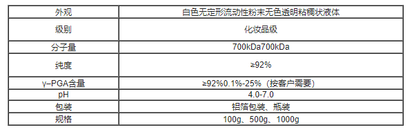 γ-聚谷氨酸(γ-PGA)(γ-聚麸胺酸)及γ-PGA水凝胶产品指标及规格
