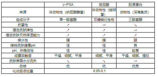 聚谷氨酸具有美白的功效,可显著抑制酪氨酸酶活性,从而抑制皮肤黑色素生成;其水胶为无色无味透明柔软胶质;有独特的三维空间结构, 因而具有超强的吸水保湿能力。此外,聚谷氨酸还具有抑制透明质酸酶活性的作用,可缓解因透明质酸酶的活化而引起的皮肤结缔组织中透明质酸的降解,进而防止因皮肤结缔组织疏松导致的皮肤失去弹性和产生皱纹。聚谷氨酸可能同时兼具美白、保湿和防皱三重功效,其在功效型化妆品中的应用将具有广阔的市场前景。