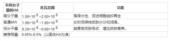 玻尿酸因其优异的保湿性而常用于护肤品的配方中,如洗面奶、面霜等。透明质酸的大小范围为 0.20×106-2.50×106 Da。不同分子量的透明质酸在化妆品中具有不同的作用。